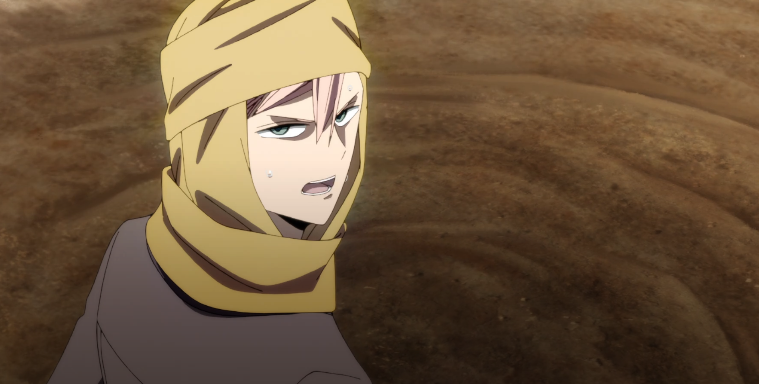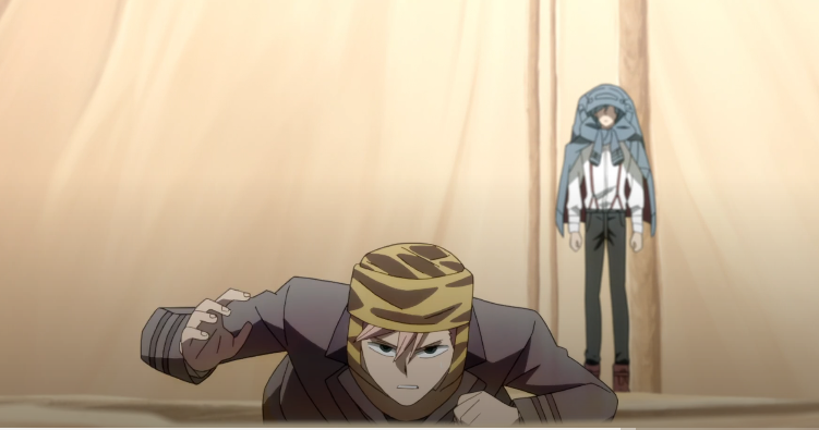 He gets on his hands and knees, lower half stained with sand, and catches his breath. His head glances over his shoulder, and you can hear::